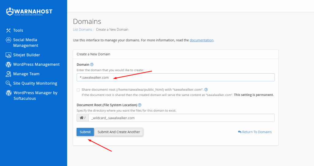 domainutama.com, maka wildcard Anda akan menjadi*.domainutama.com. - Document Root: Ini adalah direktori tempat semua file yang diakses melalui wildcard akan disimpan. Secara umum, Anda bisa mengisinya dengan